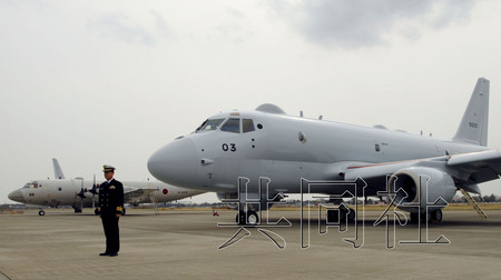 圖為3月29日下午抵達神奈川縣厚木基地的海上自衛隊新型噴氣式反潛巡邏機“P-1”。左后方為現有的反潛巡邏機“P-3C”。