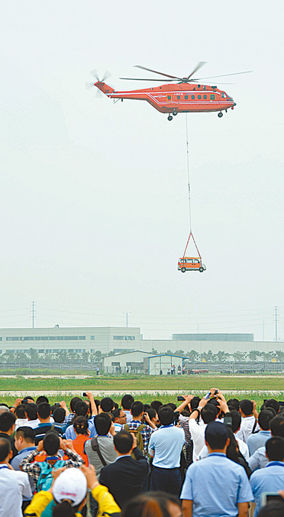 5日,開(kāi)幕式上,飛行員駕駛13噸重的AC313直升機,模擬將交通事故中受損的車(chē)輛吊離現場(chǎng)。