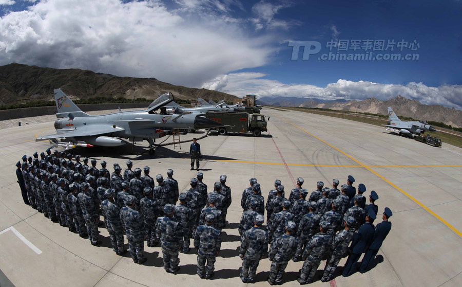 9月10日20時(shí)55分,空軍首批入藏新兵從成都乘列車(chē)奔赴雪域高原,記者隨同入藏一周,用鏡頭記錄新兵入營(yíng)過(guò)程。圖為9月13日下午,入營(yíng)第二課,現場(chǎng)觀(guān)摩雪域高原航空兵戰備值班,強化打仗意識,培養軍人血性。特約記者劉應華 攝