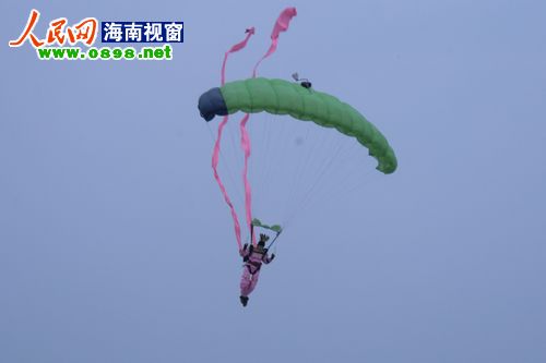17日上午,2011環(huán)海南飛行拉力賽在?谂e行了隆重的開(kāi)幕儀式。直升機同心圓旋轉、模型機超低空飛行、跳傘隊上演“七仙女下凡”……八一跳傘隊、河南跳傘隊、翱翔中國航空模型特技飛行表演隊等在萬(wàn)綠園旁人工島上演了一場(chǎng)華麗的飛行表演秀,一系列超乎想象的精彩表演讓現場(chǎng)觀(guān)眾嘆為觀(guān)止。