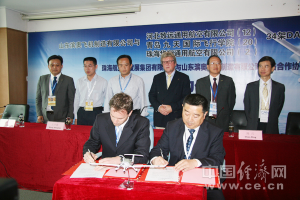 中國經(jīng)濟網(wǎng)珠海航展特派記者團 記者王飛 11月16日報道 15日,山東濱奧飛機制造有限公司在珠海航展上分別與河北致遠通用航空有限公司、青島九天國際飛行學(xué)院、珠海華翔通用航空有限公司簽署總共銷(xiāo)售34架DA40飛機購機合同定單,并同時(shí)與珠海航空城簽署戰略合作協(xié)議。
