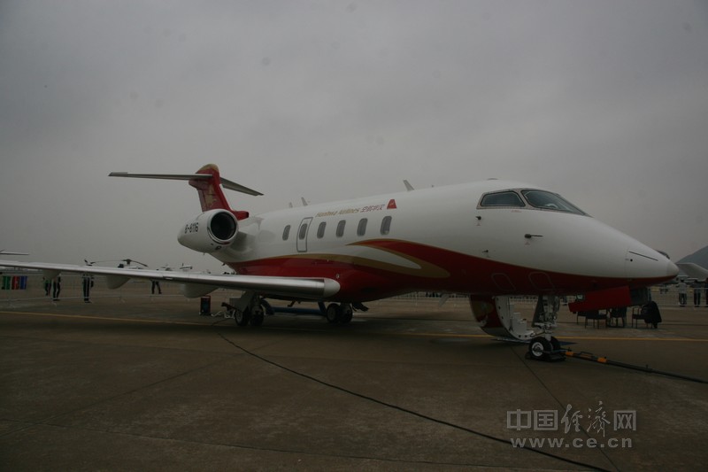 中國經(jīng)濟網(wǎng)珠海航展記者團記者王飛報道 漢華航空有限公司引進(jìn)的第2架挑戰者300公務(wù)機在珠海航展進(jìn)行靜態(tài)展示,該機編號B-8116,系加拿大龐巴迪公司出品。