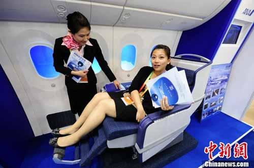 5月29日,日本全日空航空公司(ANA)在首屆中國(北京)國際服務(wù)貿易交易會(huì )(“京交會(huì )”)上展示該公司訂購的全球首架波音787“夢(mèng)想客機”的模擬客艙,參觀(guān)者可以親身體驗舒適的座椅。(圖:侯宇攝)