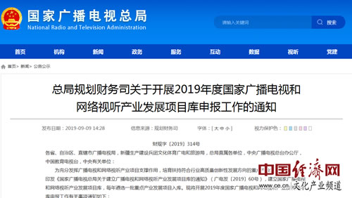 總局規劃財務(wù)司關(guān)于開(kāi)展2019年度國家廣播電視和網(wǎng)絡(luò )視聽(tīng)產(chǎn)業(yè)發(fā)展項目庫申報工作的通知
