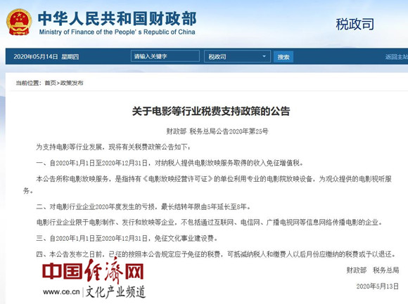 財政部、稅務(wù)總局:2020年免征文化事業(yè)建設費 免征電影放映服務(wù)增值稅