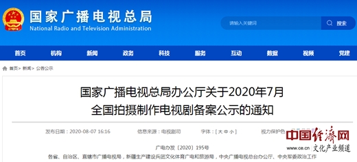 經(jīng)濟日報-中國經(jīng)濟網(wǎng)北京8月10日訊 近日,國家廣播電視總局公布7月份全國拍攝制作電視劇備案公示情況,據悉,2020年7月,全國電視劇拍攝制作備案公示的劇目共49部、1640集。