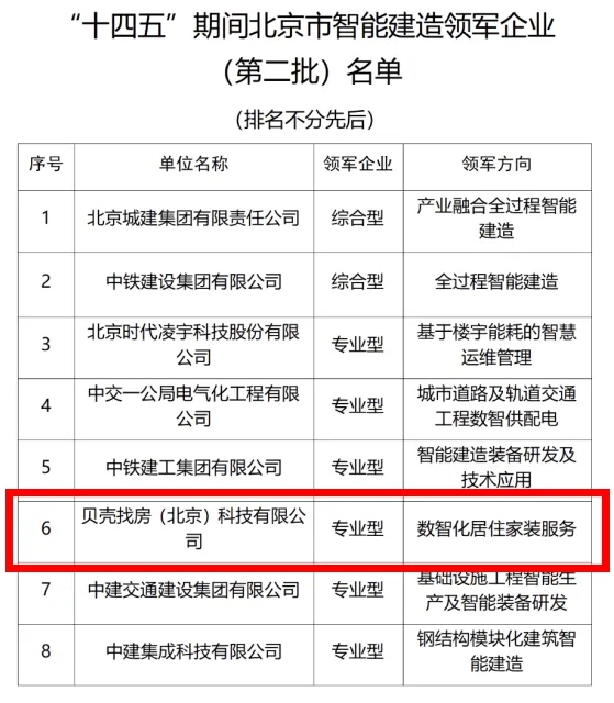 8月27日,北京市住房和城鄉建設委員會(huì )公布了“十四五”期間北京市智能建造領(lǐng)軍企業(yè)(第二批)名單,貝殼找房(北京)科技有限公司等8家企業(yè)入選,貝殼整裝是唯一入選該名單的家裝企業(yè)。