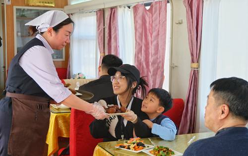 春運首日鐵路天津客運段值乘的T253次列車(chē)上餐車(chē)服務(wù)人員正在為旅客提供用餐服務(wù)。(楊寶森/攝)