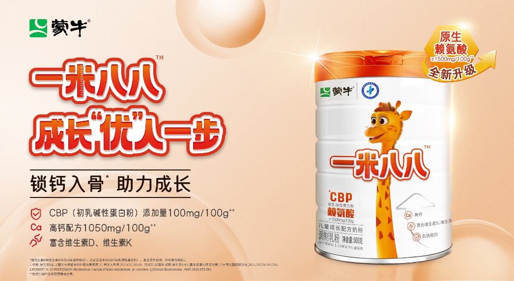 為了滿(mǎn)足兒童在不同成長(cháng)階段的需求,蒙牛一米八八首創(chuàng )添加初乳堿性蛋白(CBP),鎖鈣入骨,志在為中國兒童骨骼成長(cháng)發(fā)育提供專(zhuān)業(yè)的解決方案。上半年,與中國學(xué)生營(yíng)養與健康促進(jìn)會(huì )合作科研實(shí)證,蒙牛一米八八奶粉針對學(xué)齡前兒童干預組在60天內身高增長(cháng)明顯,相較于對照組,身高差異高達30%。憑借強大的科研優(yōu)勢及產(chǎn)品品質(zhì),蒙牛一米八八榮獲世界乳品創(chuàng )新獎的兒童乳制品優(yōu)秀獎,夯實(shí)了兒童骨骼發(fā)育營(yíng)養領(lǐng)域的權威地位。