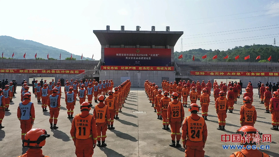 福建省森林消防總隊2024年“火焰藍”滅火專(zhuān)業(yè)實(shí)戰技能比武開(kāi)幕式現場(chǎng)。 蔡增欣/攝