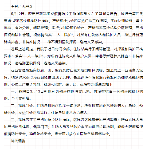 針對近日湖北羅田縣人民醫院收治新冠肺炎確診病例等傳言,5月22日,羅田縣人民醫院發(fā)布《關(guān)于本院疫情防控和醫療秩序一切正常的通告》辟謠稱(chēng),該院自3月13日新冠肺炎確診病例清零以來(lái),再沒(méi)有收治一例確診或疑似病例,至今零新增。目前,該院門(mén)診、住院各科醫療秩序一切正常,所有科室均正常接診病人;急診、預檢分診、發(fā)熱門(mén)診正常運行,住院各科正常收治病人。
