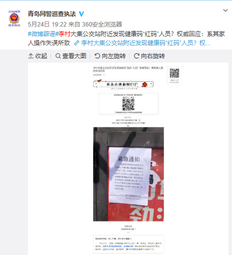 據半島都市報官微5月24日報道,針對“發(fā)現一名健康通行碼紅碼人員”一事,經(jīng)落實(shí),系其家人操作失誤所致,該名人員實(shí)際持有綠碼,無(wú)健康問(wèn)題。此外,5月24日,山東省青島市公安局網(wǎng)絡(luò )警察支隊官方微博也對此傳言進(jìn)行了辟謠。