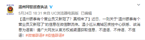 據@溫州網(wǎng)警巡查執法5月24日消息,從鹿城區疾控中心獲悉,網(wǎng)傳“溫州銀泰有營(yíng)業(yè)員感染新冠病毒”系謠言。請廣大網(wǎng)友從官方權威渠道獲取信息,不造謠,不傳謠,不信謠。