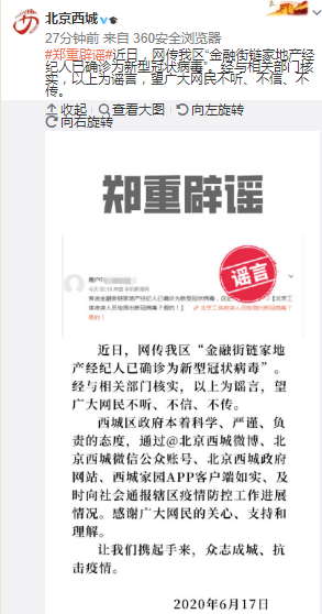 經(jīng)濟日報-中國經(jīng)濟網(wǎng)6月17日訊(記者朱國旺 郭文培)據北京市西城區人民政府新聞辦公室官方微博17日消息,經(jīng)與相關(guān)部門(mén)核實(shí),網(wǎng)傳西城區“金融街鏈家地產(chǎn)經(jīng)紀人已確診為新型冠狀病毒”為謠言,望廣大網(wǎng)民不聽(tīng)、不信、不傳。