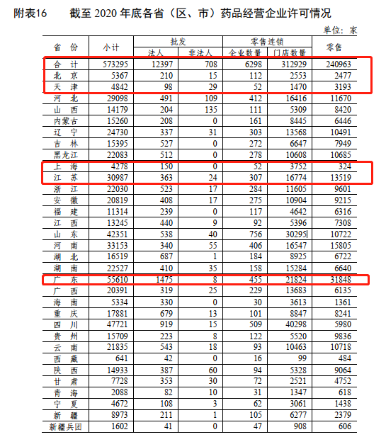 相反,在有“紅線(xiàn)”限制地區的北京、上海天津一帶,其零售連鎖和零售藥店卻少之又少。如上海,截止2020年底,其零售連鎖卻只有3804家,零售藥店僅有324家。