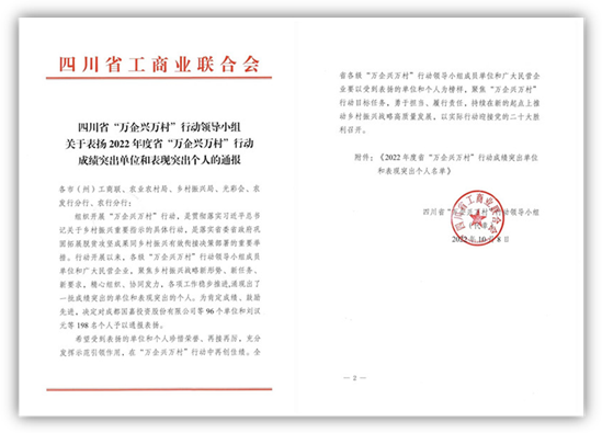 會(huì )上,表彰了2022年度“萬(wàn)企興萬(wàn)村”行動(dòng)成績(jì)突出單位和表現突出個(gè)人。其中,全國人大代表、成都涼山商會(huì )會(huì )長(cháng)、好醫生集團董事長(cháng)耿福能受到四川省“萬(wàn)企興萬(wàn)村”行動(dòng)領(lǐng)導小組通報表?yè)P,獲評2022年度四川省“萬(wàn)企興萬(wàn)村”行動(dòng)表現突出個(gè)人榮譽(yù)稱(chēng)號。成都涼山商會(huì )常務(wù)副秘書(shū)長(cháng)、好醫生集團鄉村振興工作組常務(wù)副組長(cháng)謝芳福同獲表彰。