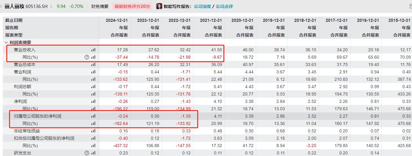 Wind顯示,2021年至2024年,麗人麗妝營(yíng)收持續回落,歸母凈利潤在2022年、2024年出現虧損。