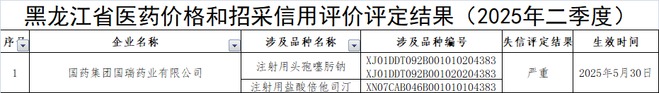 中國經(jīng)濟網(wǎng)北京85日訊(記者 郭文培)日前,黑龍江省公共資源交易中心發(fā)布《黑龍江省醫藥價(jià)格和招采信用評價(jià)評定結果的公示(2025年二季度)》。該中心對醫藥價(jià)格和招采失信事項目錄清單內有悖誠實(shí)信用的行為開(kāi)展了信用等級評定,國藥集團國瑞藥業(yè)有限公司被評為“嚴重失信”。