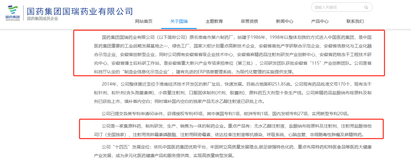 國藥集團國瑞藥業(yè)有限公司官網(wǎng)介紹,該公司原名淮南市第六制藥廠(chǎng),始建于1986年,1998年以整體劃撥的方式進(jìn)入中國醫藥集團,是中國醫藥集團重要的工業(yè)戰略發(fā)展基地之一。