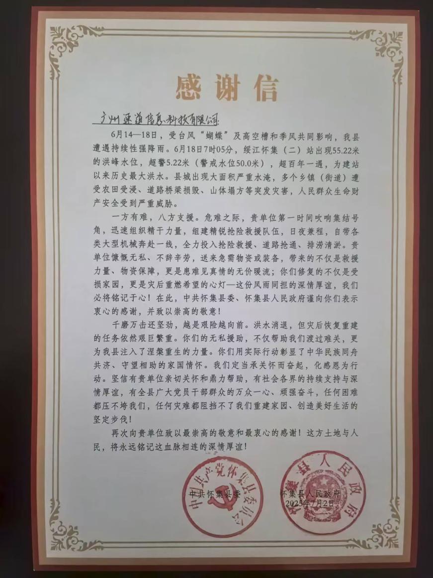 近日,藥師幫(廣州速道信息科技有限公司)收到中共懷集縣委、懷集縣人民政府發(fā)來(lái)的感謝信,對公司在懷集縣抗洪救災及后續恢復重建工作中的積極貢獻給予高度肯定與誠摯謝意。