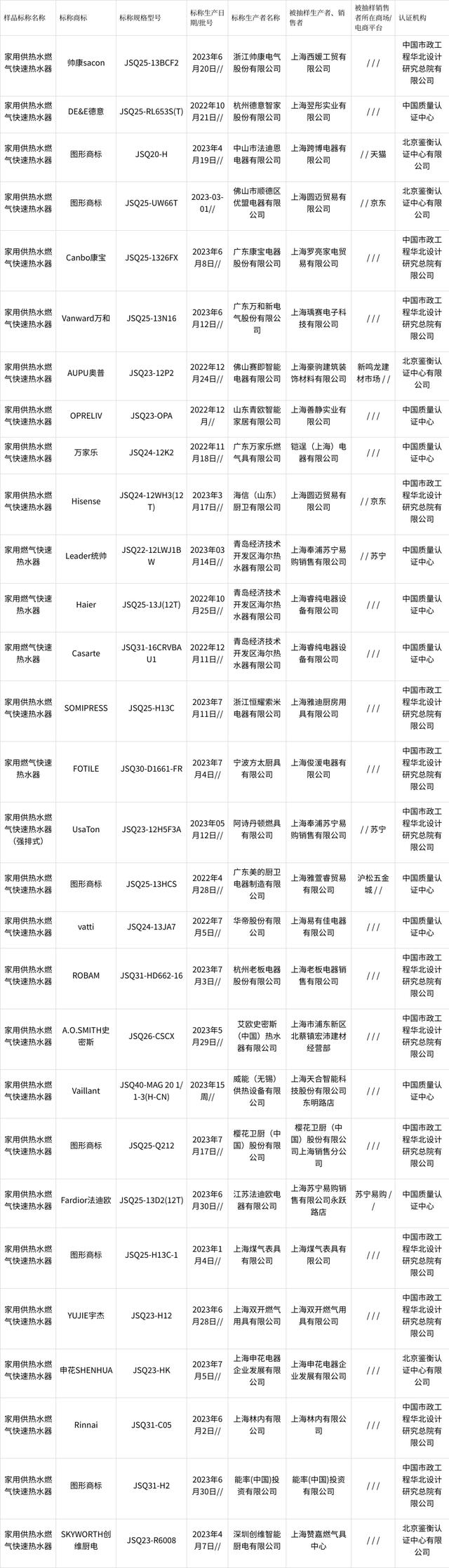2023年上海市家用燃氣快速熱水器產(chǎn)品質(zhì)量監督抽查所檢項目符合相關(guān)標準的產(chǎn)品
