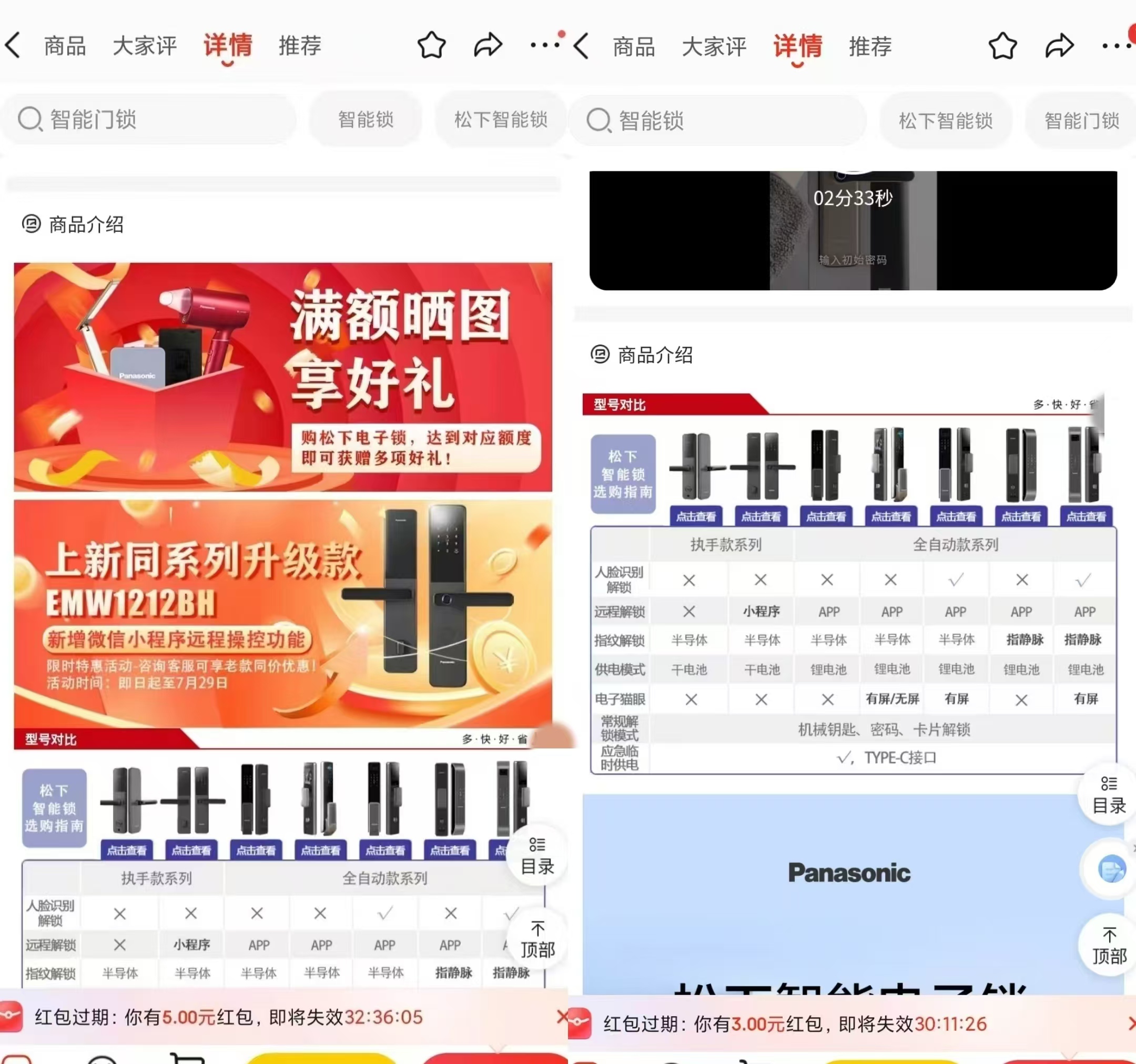 松下智能門(mén)鎖的商品介紹頁(yè)已做調整(前后對比)。資料圖片