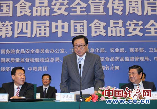 6月11日至17日被確定為今年的全國食品安全宣傳周。宣傳周主題為“共建誠信家園 同鑄食品安全”。全國食品安全宣傳周啟動(dòng)儀式由國務(wù)院食品安全委員會(huì )辦公室、工業(yè)和信息化部、農業(yè)部、商務(wù)部、衛生部、國家工商總局、國家質(zhì)檢總局、國家糧食局、國家食品藥品監管局、中國科協(xié)共同主辦,經(jīng)濟日報社、中糧集團承辦,中國經(jīng)濟網(wǎng)執行承辦。圖為全國人大常委會(huì )副委員長(cháng)華建敏宣布全國食品安全宣傳周啟動(dòng) 裴小閣攝