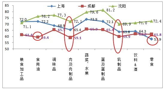 針對食品安全現狀信心指數較低的三個(gè)城市:上海、成都、沈陽(yáng)。沈陽(yáng)表現相對較好,信心指數較高;其次是上海;最低的是成都。其中肉及肉制品和乳制品在三大城市中的安全信心指數都相對偏低,直接影響了三大城市的綜合信心程度。此外,食用油在成都的安全信心指數、零食在上海的安全信心指數也有待提高。