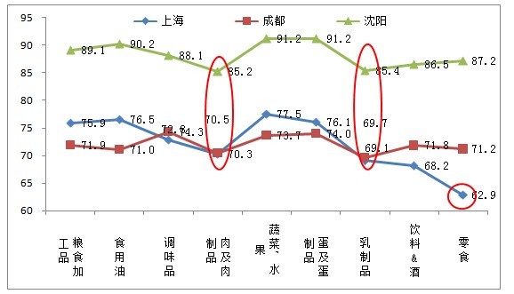 進(jìn)一步分析未來(lái)改善信心指數較低的上海、成都、沈陽(yáng)三大城市,發(fā)現沈陽(yáng)信心指數相對較高,上海和成都相對比較低。而且,肉及肉制品和乳制品依然成為三大城市普遍沒(méi)有信心的兩類(lèi)食品。此外,上海對零食的改善信心也非常不足。