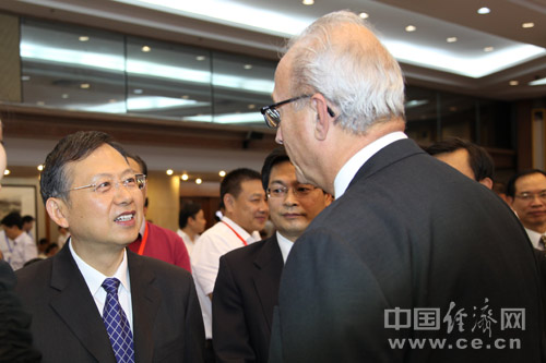 由中國道路交通安全協(xié)會(huì )、中國汽車(chē)技術(shù)研究中心和中國經(jīng)濟網(wǎng)共同主辦的“2013中國道路交通安全論壇”于8月29日在北京首都大酒店舉行。圖為公安部副部長(cháng)黃明與國際道路交通安全協(xié)會(huì )主席高斯進(jìn)行交流。中國經(jīng)濟網(wǎng) 郝紅波 攝影