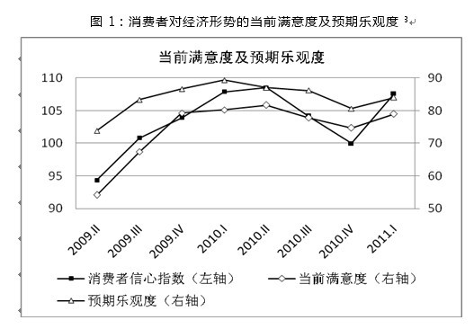 2011年一季度中國消費者信心指數為108,比2010年四季度大幅上升8點(diǎn),接近近兩年高點(diǎn)。消費者對當前經(jīng)濟形勢的滿(mǎn)意度和對未來(lái)經(jīng)濟走勢的預期樂(lè )觀(guān)度均明顯上升,持樂(lè )觀(guān)態(tài)度的消費者比重均接近兩年內的最高點(diǎn)。